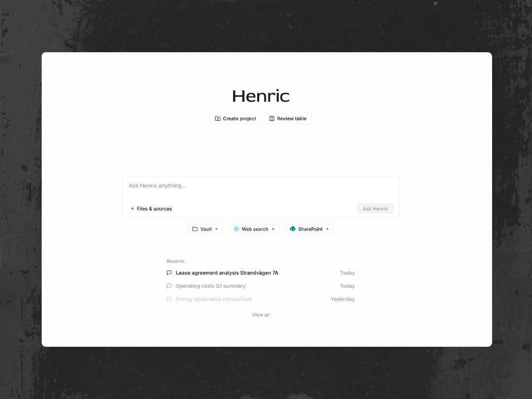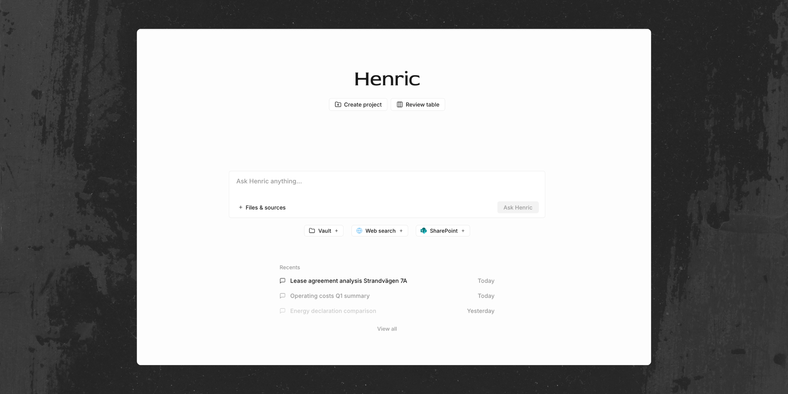Every property comes with decades of documentation. Henric brings it all into one place — searchable, extractable, and ready for decisions only your team can make.